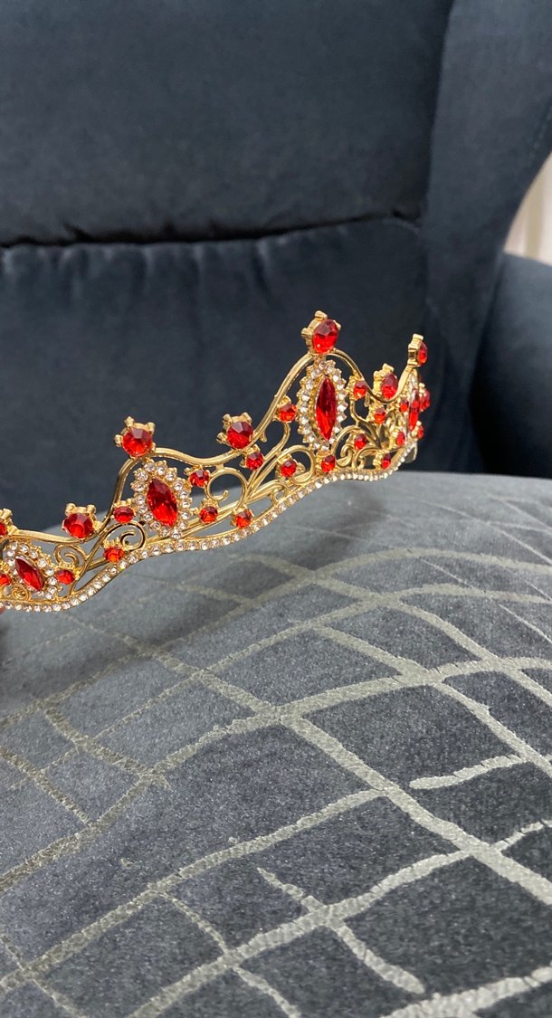 Kırmızı cam taşlar ve pullarla süslenmiş, klasik ve gösterişli tarzda kadın tacı.