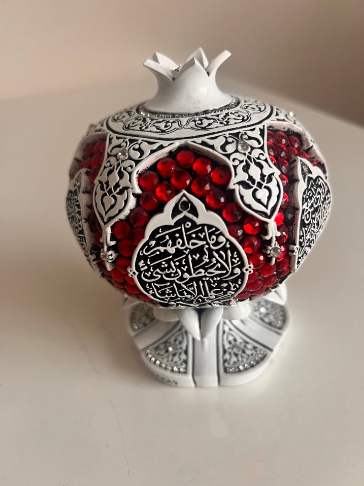 İnce siyah ve beyaz desenlerle süslenmiş, canlı kırmızı taşlarla bezenmiş nar şeklinde detaylı hat yazılı figür.