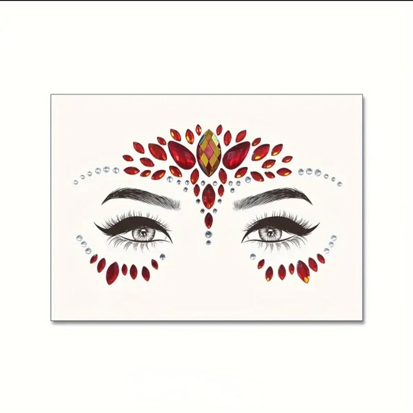 Göz ve alın çevresine yerleştirilen kırmızı ve şeffaf taşlarla süslenmiş dekoratif yüz maskesi. ✨