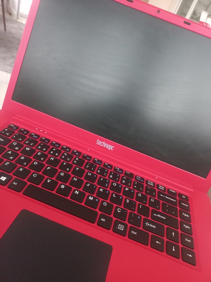 Kırmızı renkli Technope marka dizüstü bilgisayar, tam klavye ve geniş ekrana sahiptir. bataryası değişmesi lazım tamirci öyle demişti ama ben uğraşmak istemedim başka sorunu yok. o yüzden uygun fiyata koyuyorum