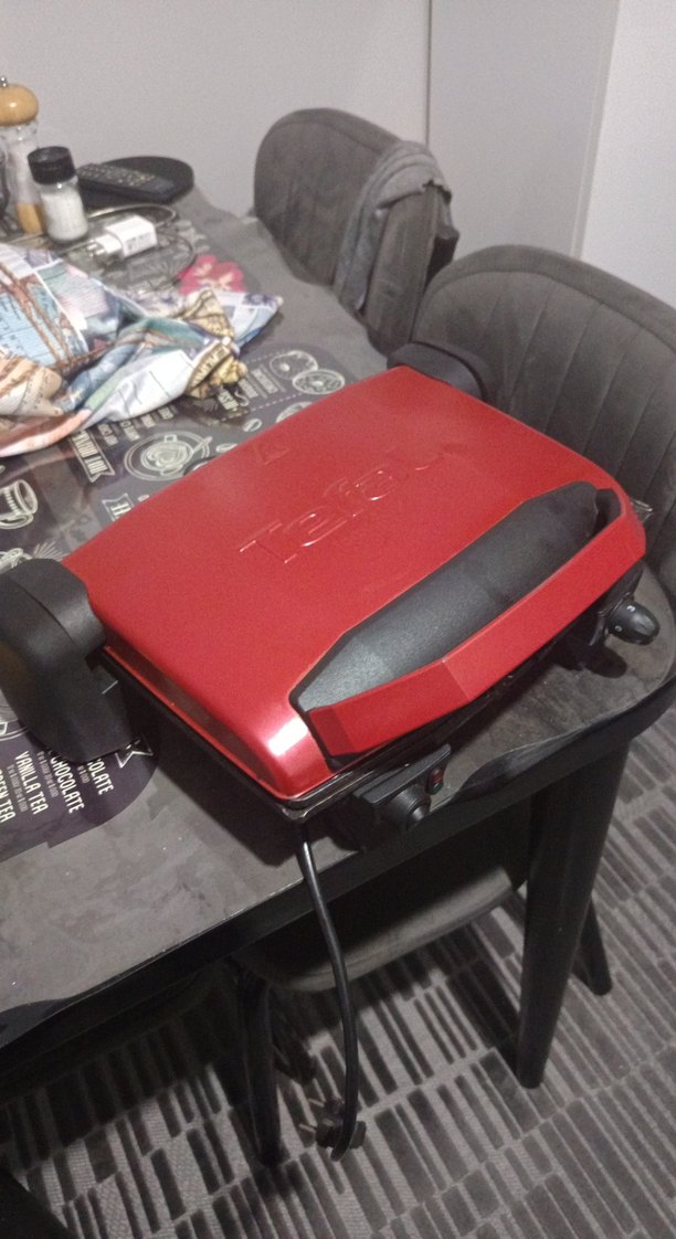 Kırmızı renkte Tefal tost makinesi, sağlam tutma sapı ve ayarlanabilir ayarlarla kompakt tasarıma sahiptir.