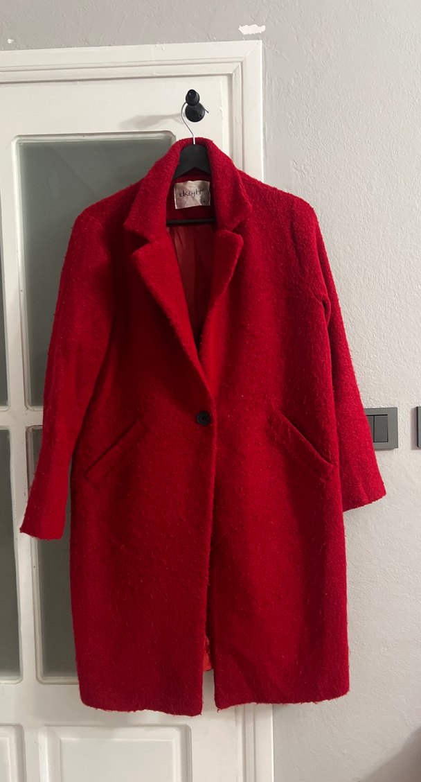 Kadınlar için tek düğmeli, iki yan cepli kırmızı kaban. Yumuşak ve sıcak dokusu ile klasik yakaya sahip. Soğuk havalar için uygun. ❄️ biraz tüylenme var ama sırıtmıyor temiz bir sorunu yoktur