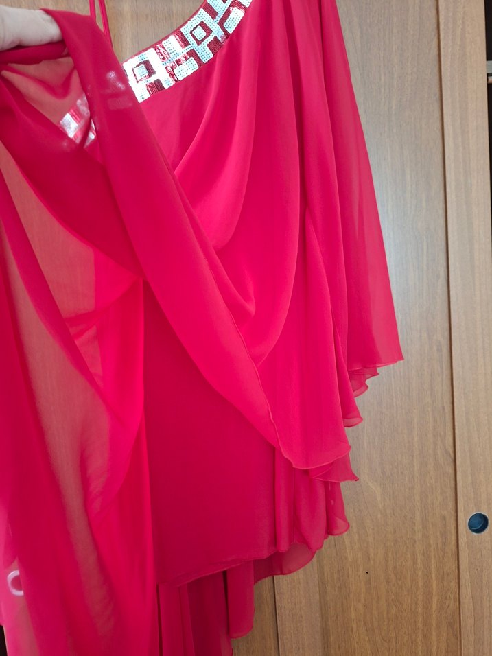 Kırmızı renkli, Tek omuz askılı ve Göğüs detayı payetli işlemeye sahip kısa abiye elbise. İpeksi kumaşı ile farklı tarz duruşu ile şık bir elbisedir.