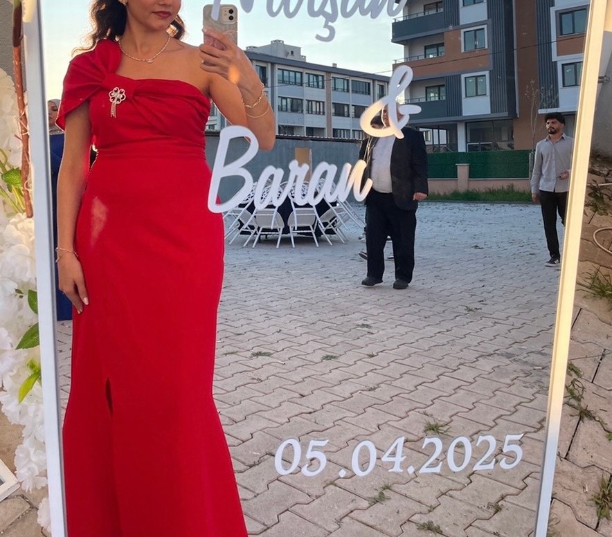 Kırmızı Tek Omuz Broş Detaylı Yırtmaçlı Uzun Abiye Elbise S Beden sadece bir kere giyildi, boyum 163 daha uzun boylular için kısa gelebilir