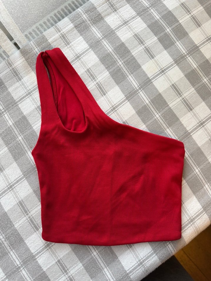 Kırmızı, tek omuzlu, kolsuz crop top, düz ve sıkı kesimli, sentetik kumaştan, dış mekanlar için şık ve sade bir görünüm sunar.