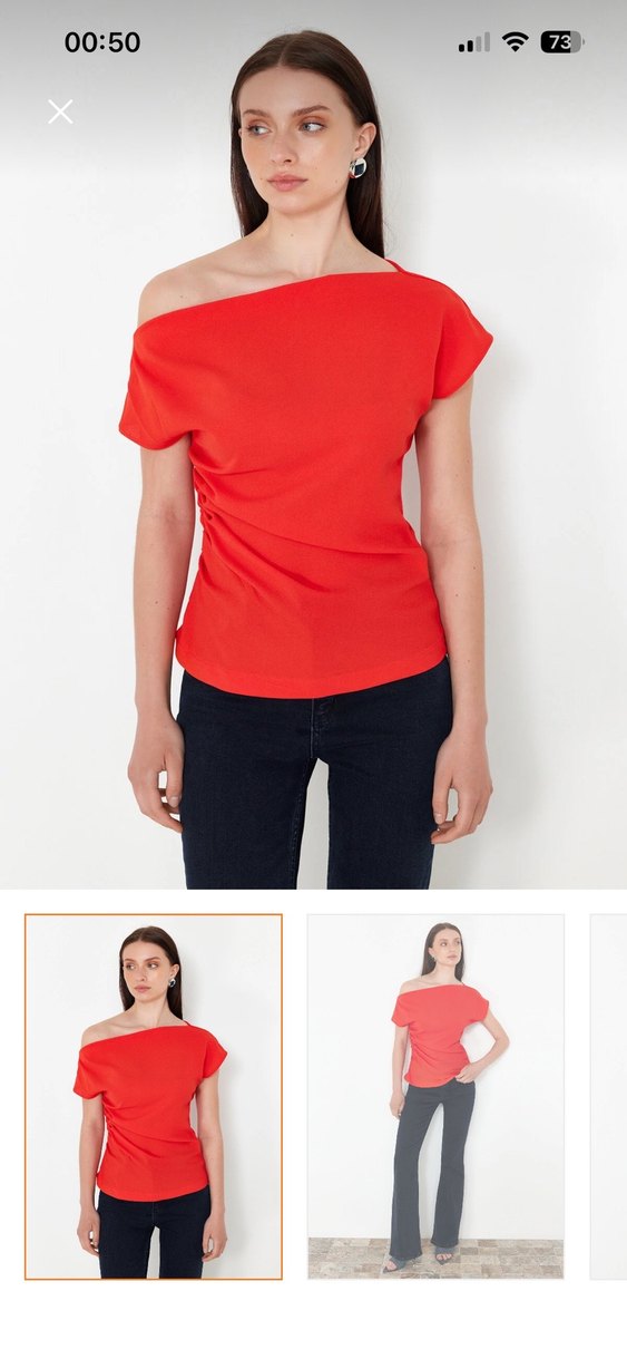 Tek omuz isterseniz omzu kapalıda kullanılır , kısa kollu, nar çiçeği renkli kadın bluz. Düz, şık ve günlük kullanıma uygun, sentetik kumaştan yapılmıştır. Normal midi boyda ve vücuda oturan kesime sahiptir. Yandan fermuarı vardır