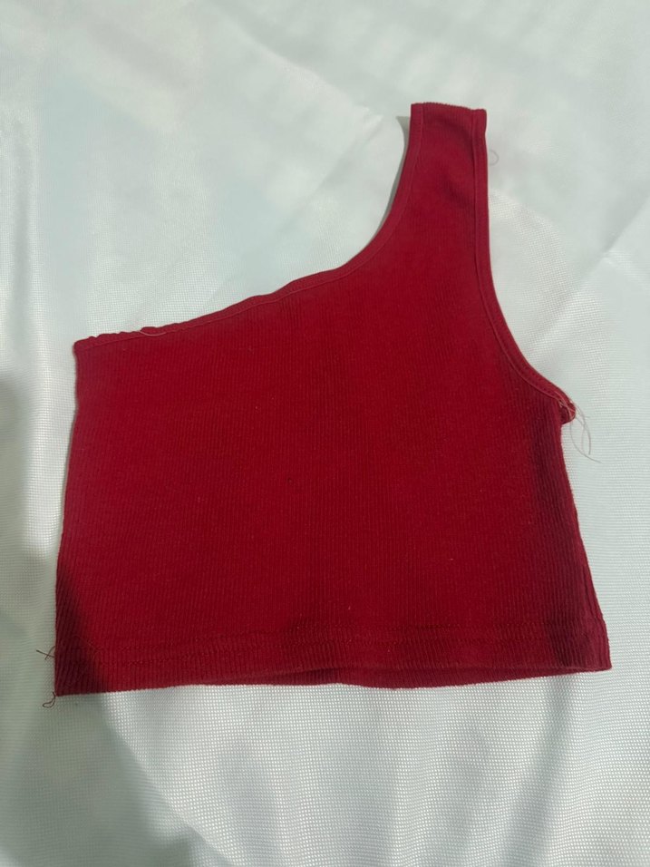 Kırmızı, tek omuzlu ve yüksek yakalı, vücuda oturan crop top. Düz ve kolsuz tasarımıyla sokak modasına uygun, dış mekan için ideal.
