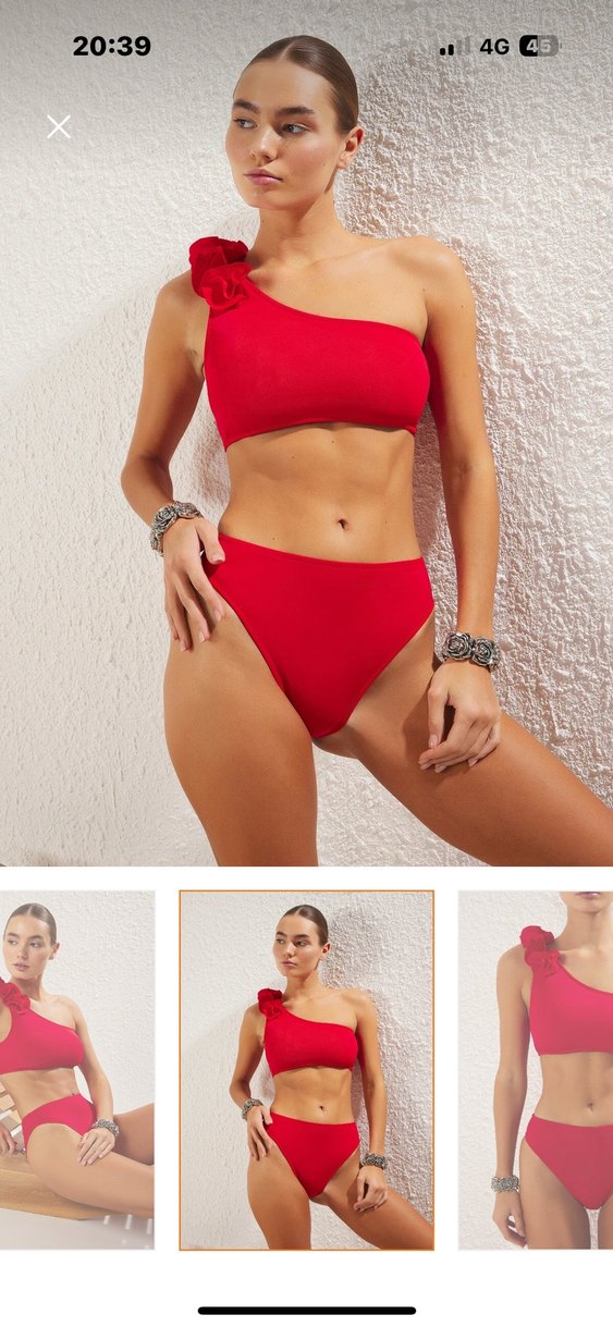 Parlak kırmızı, tek omuzlu askılı ve mini boy, modern plaj stili için tasarlanmış fitted bikini.
