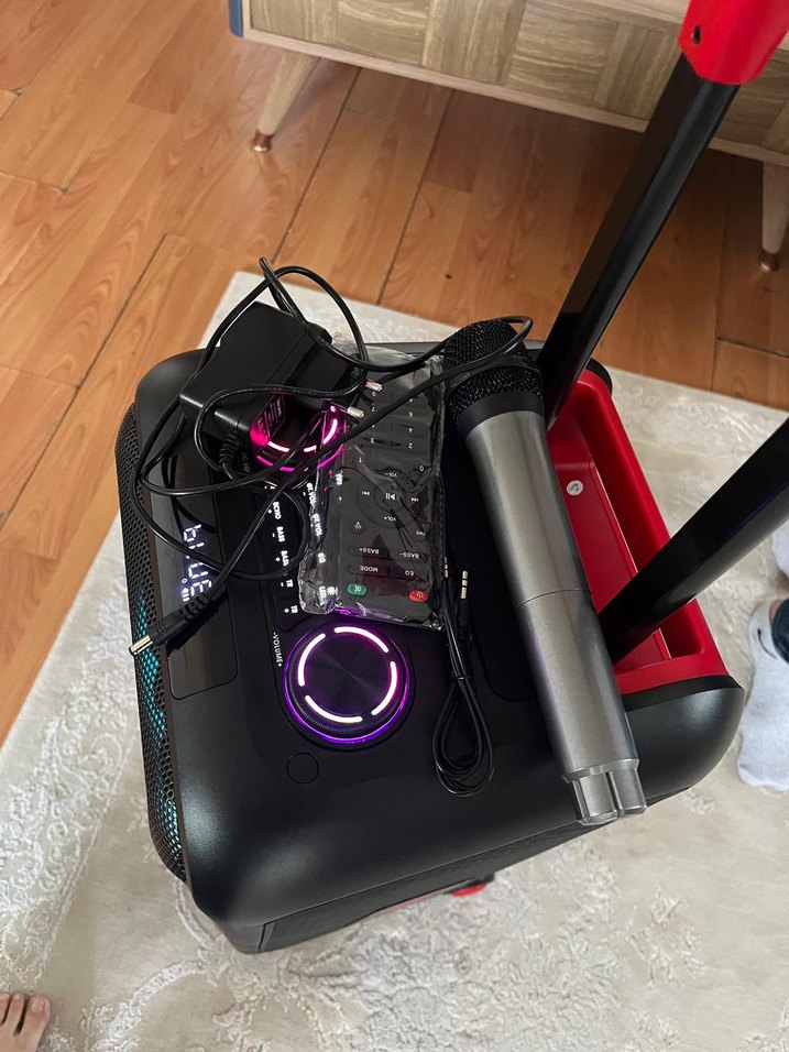 Kırmızı tekerlekli Bluetooth hoparlör, mikrofon ve uzaktan kumanda ile birlikte gelir. Taşınması kolaydır. yeni alındı isteyenlere vdeo gönderebilirim çalışır haldeyken