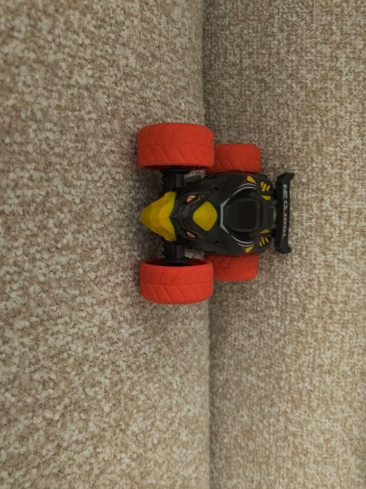 Koyu renk temalı oyuncak araba, parlak kırmızı tekerlekler ve sarı detaylarla donatılmıştır.
