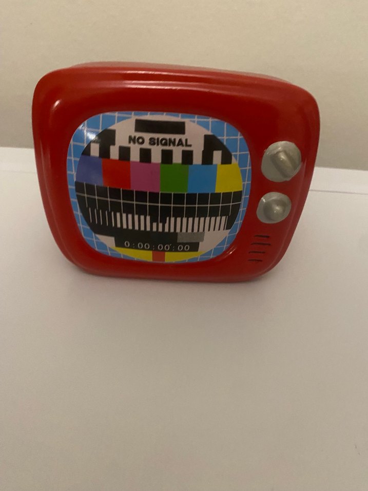 Kırmızı renkte, no signal ekranlı ve iki düğmeli renkli eğitici oyuncak televizyon. Çocuklar için canlı ve eğlencelidir.