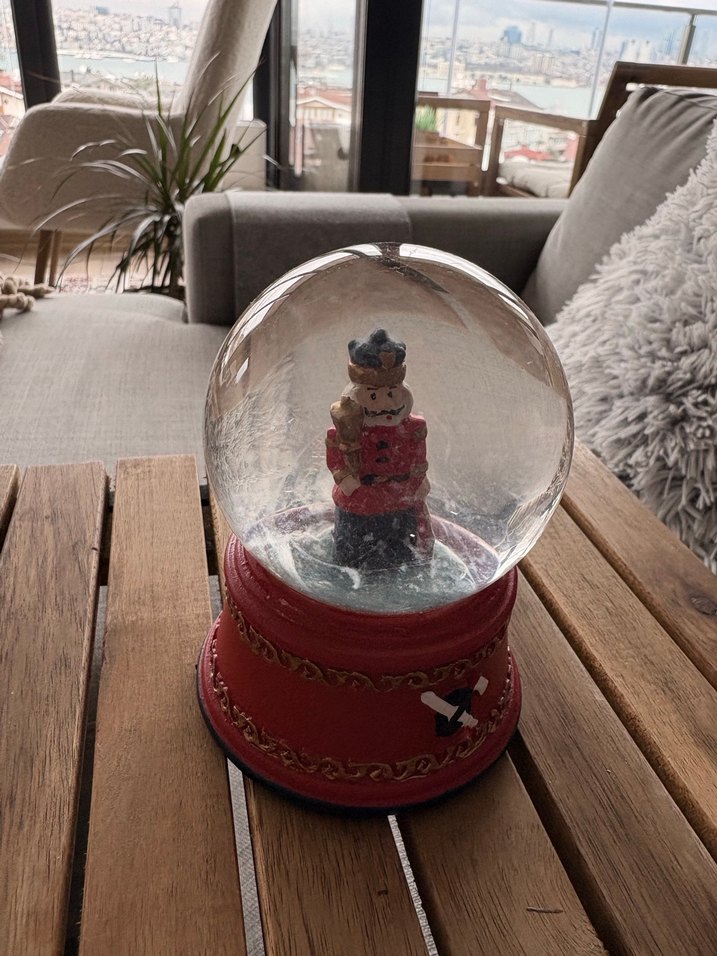 Kırmızı tabanlı ve içinde biblo bulunan renkli kar küresi, dekoratif bir atmosfer yaratır. ❄️