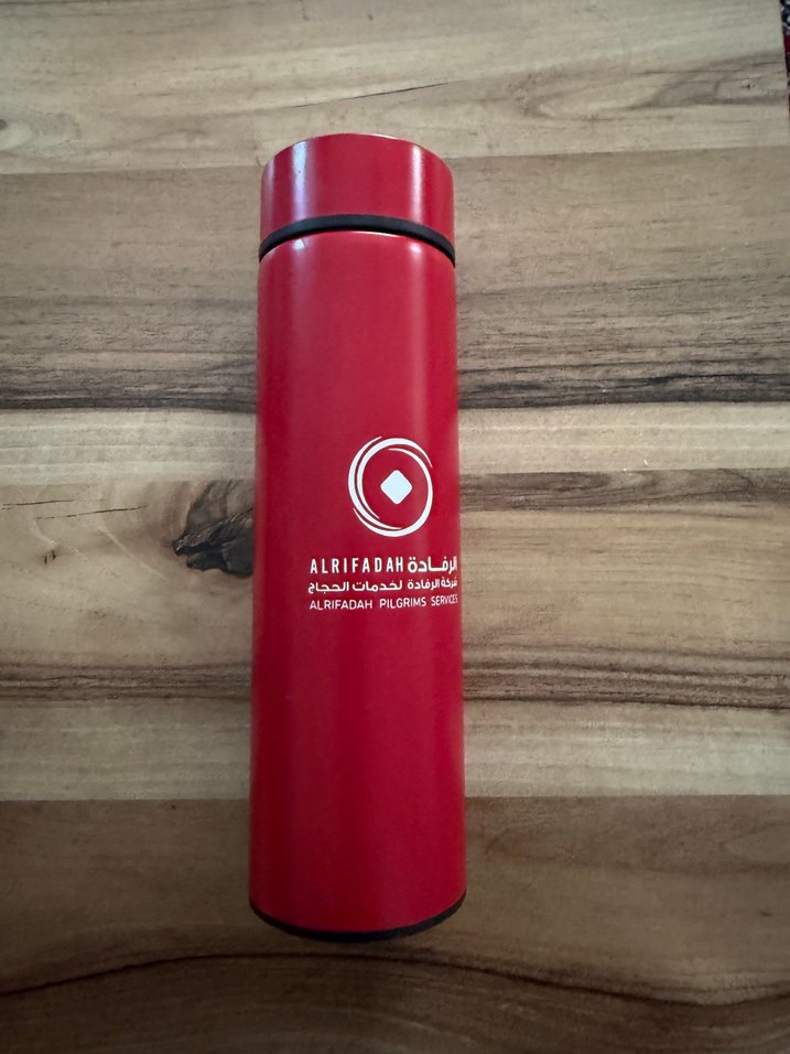 Bu kırmızı termos şişesi renkli tasarıma sahip olup içecekleri sıcak ya da soğuk tutar. "ALRIFADAH" markası bulunur.