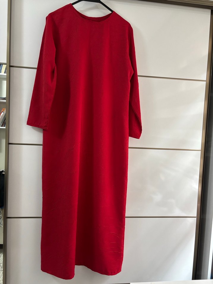 Kırmızı uzun kollu elbise, salaş kesim ve drapeli tasarıma sahiptir.minimalist ve desensiz tarzıyla günlük kullanıma uygundur.
