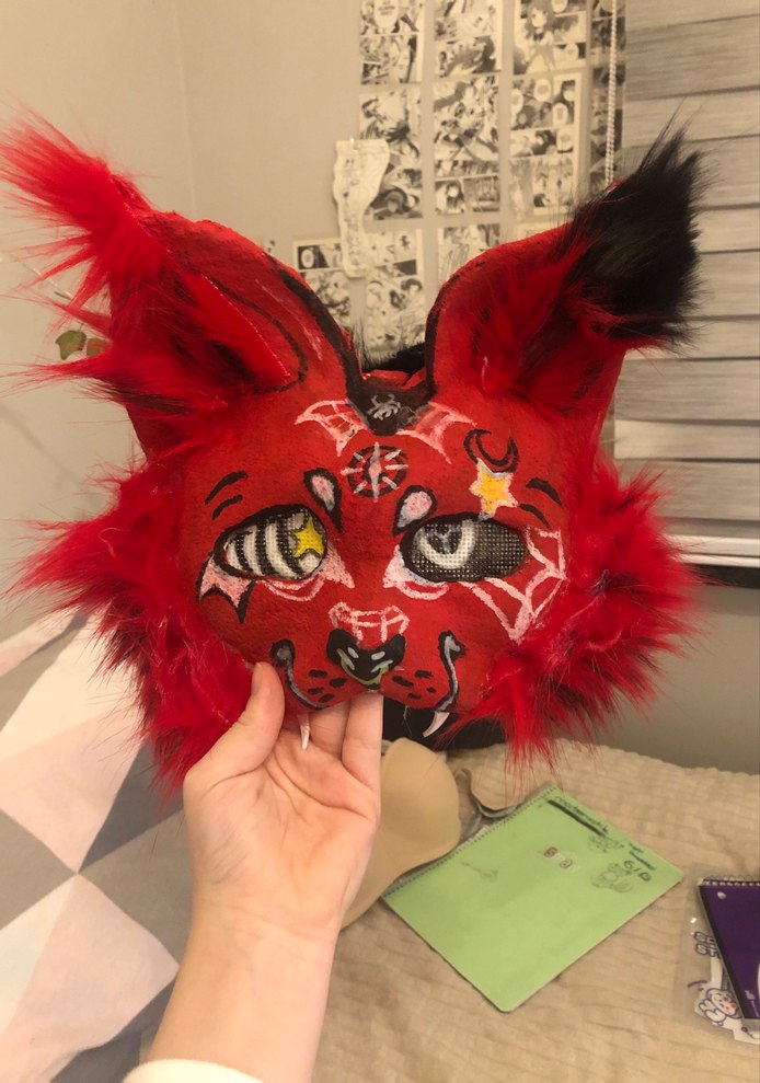Koyu kırmızı renkte, detaylı nakışlı yüz ve tüylü kulaklara sahip karakter peluş oyuncak. therian maske