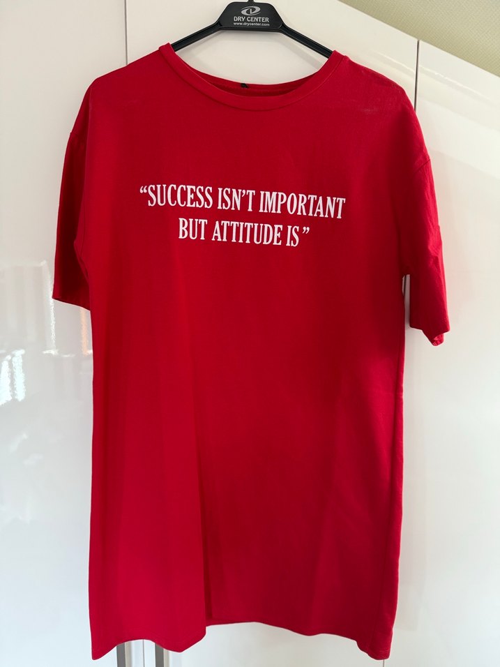 Kısa kollu, bol kesim kırmızı tişört elbise, pamuklu ve yumuşak kumaşa sahiptir. Hiç giyilmemiştir. Oversize kalıptır.