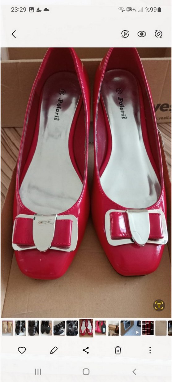 Kırmızı parlak renkte, beyaz tokalı detaylı, blok topuklu kadın babet. Kauçuk malzemeden üretilmiş, modern klasik tarzda, Paris esintili. Günlük kullanım için uygun.