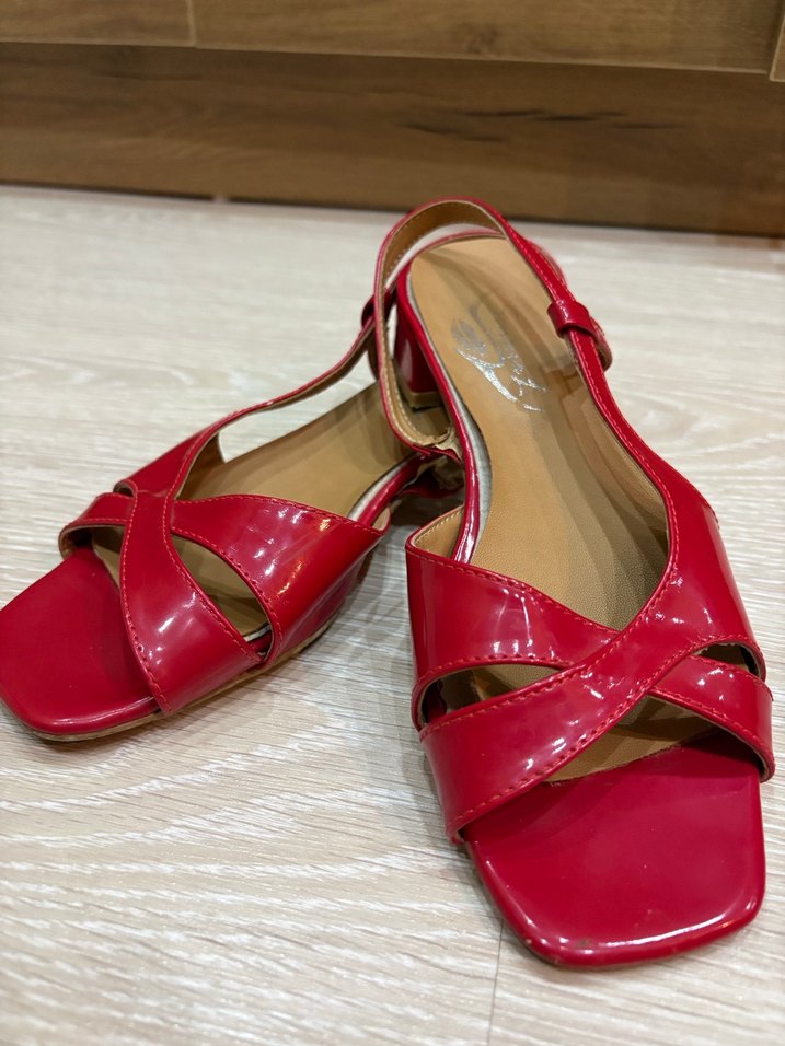 Kırmızı tokalı kadın sandalet, blok topuklu ve kauçuk malzemeden. Paris tarzı, renkli ve desensiz, günlük kullanıma uygun.
