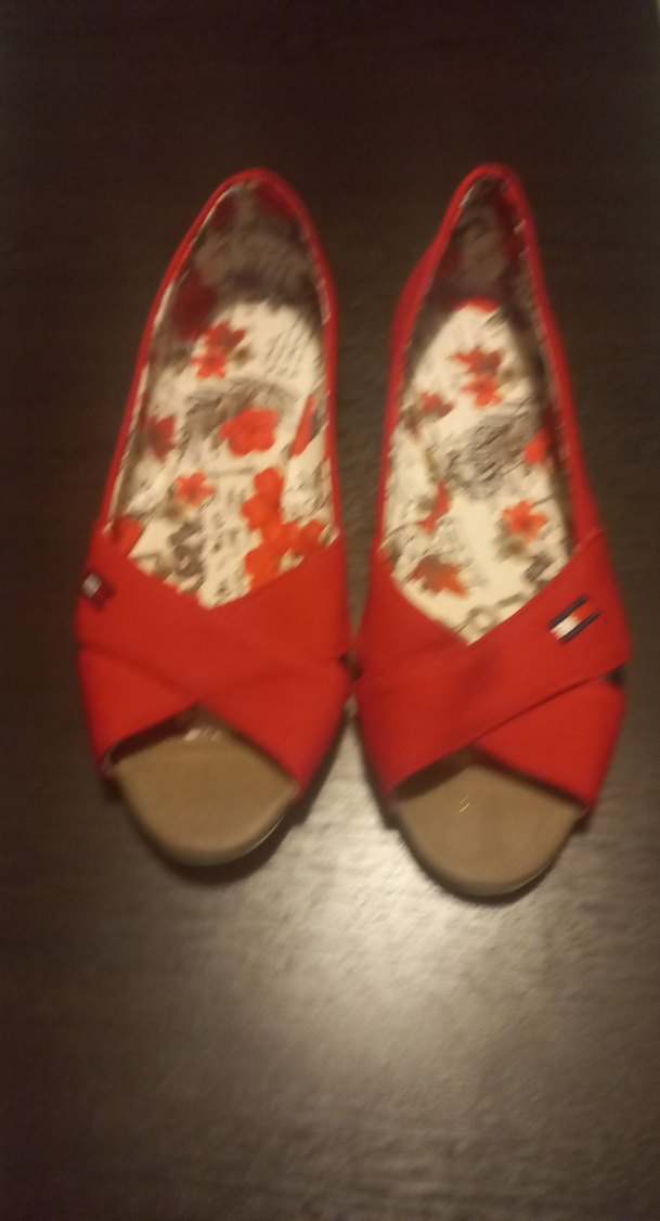 Kırmızı tokalı dolgu topuklu kadın babetler, çiçek desenli iç taban ve kauçuk materyalden üretilmiştir. Bohem tarzıyla günlük konfor sunar.