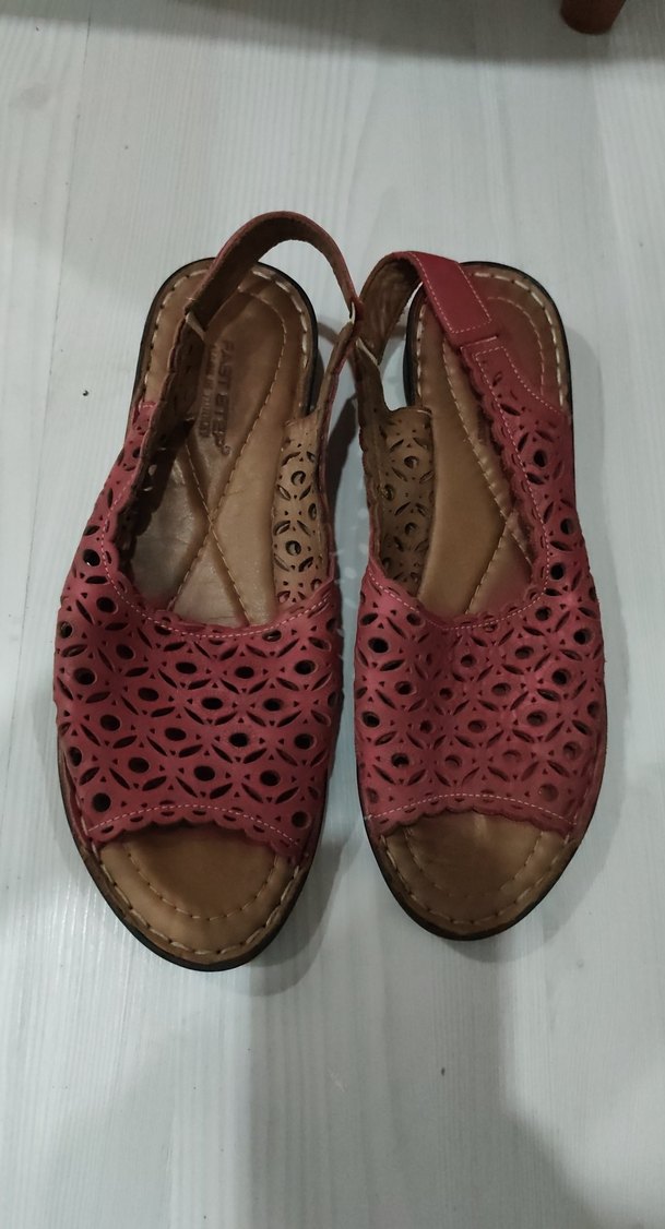 Gerçek deri Bir kaç defa giyildi kadın sandaletleri dolgu topuklu, kırmızı kauçuk üst yüzeye ve tokalı kayışa sahiptir. Bohem tarzı lazer kesim deseniyle günlük kullanım için uygundur.