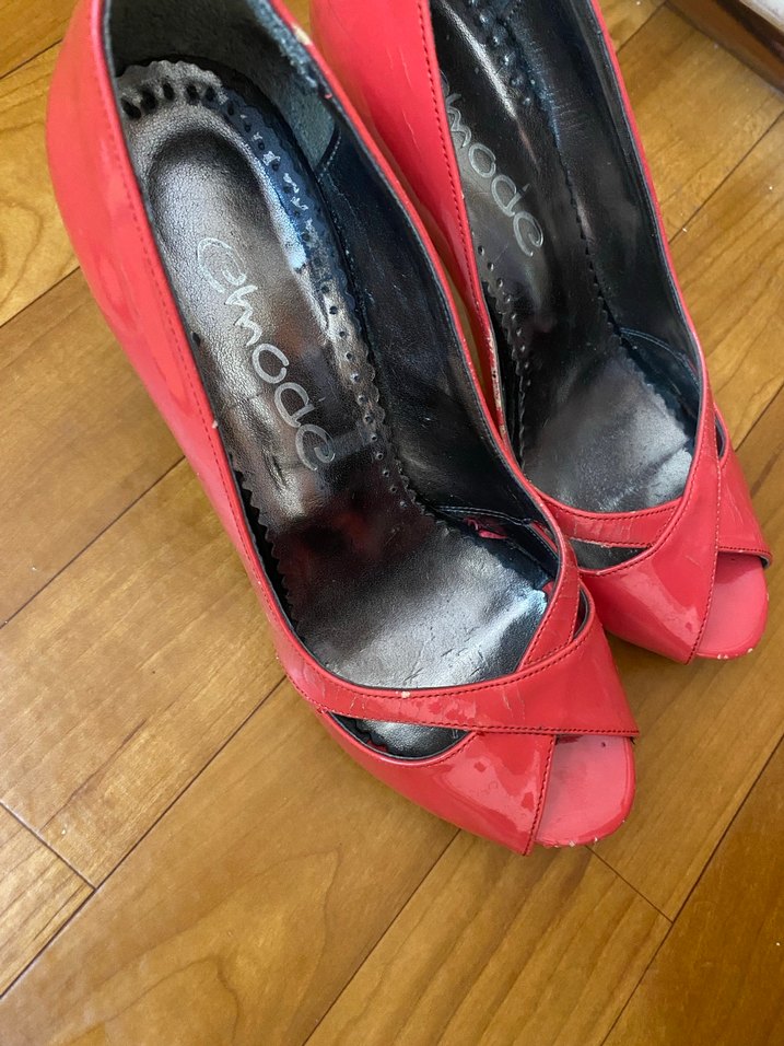 Kırmızı, tokalı dolgu topuklu kadın stiletto. Kauçuk malzemeden yapılmış, desensiz ve renkli tasarıma sahip cesur ayakkabılar. ❤️