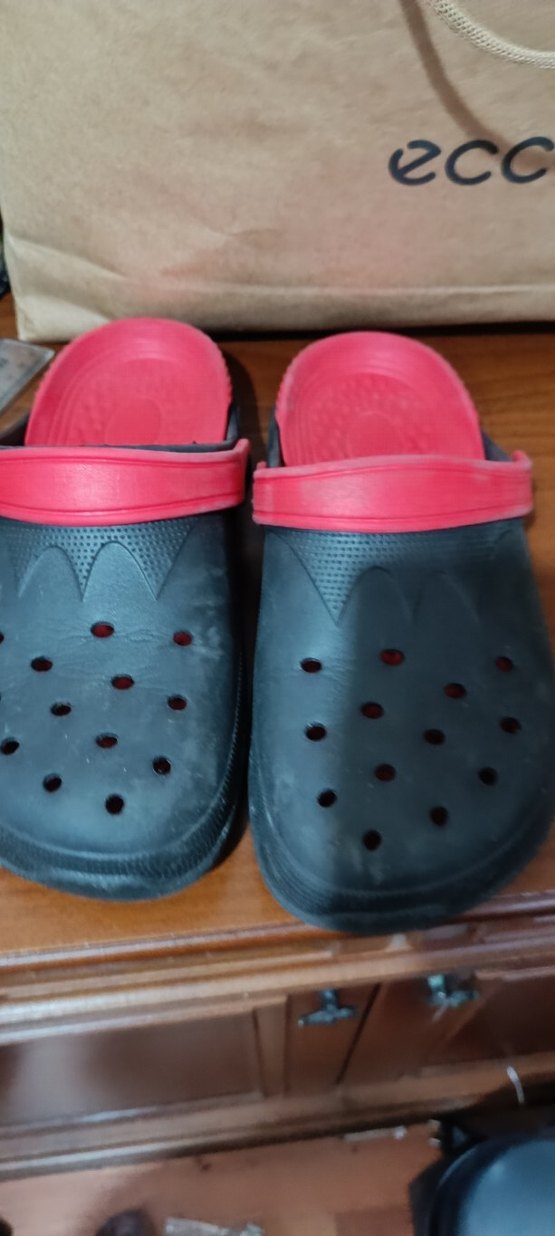 Koyu renkli kauçuk tabanlı, kırmızı tokalı kayışlı erkek Erkek terliği. Desensiz ve modaya uygun avant-garde tarzında.