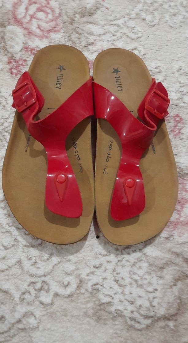 Kırmızı renkte, tokalı bantları ve dolgu topuklu lastik kadın terlik. Günlük kullanıma uygun sade ve renkli tasarım.