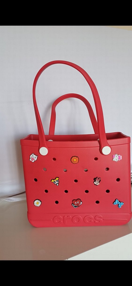 Kırmızı renkte, tokalı ve renkli baskılı detaylara sahip kadın plaj çantası. Dayanıklı plastikten üretilmiş, minimalist ve bohem-retro tarzı bir model. Günlük kullanım için uygun.