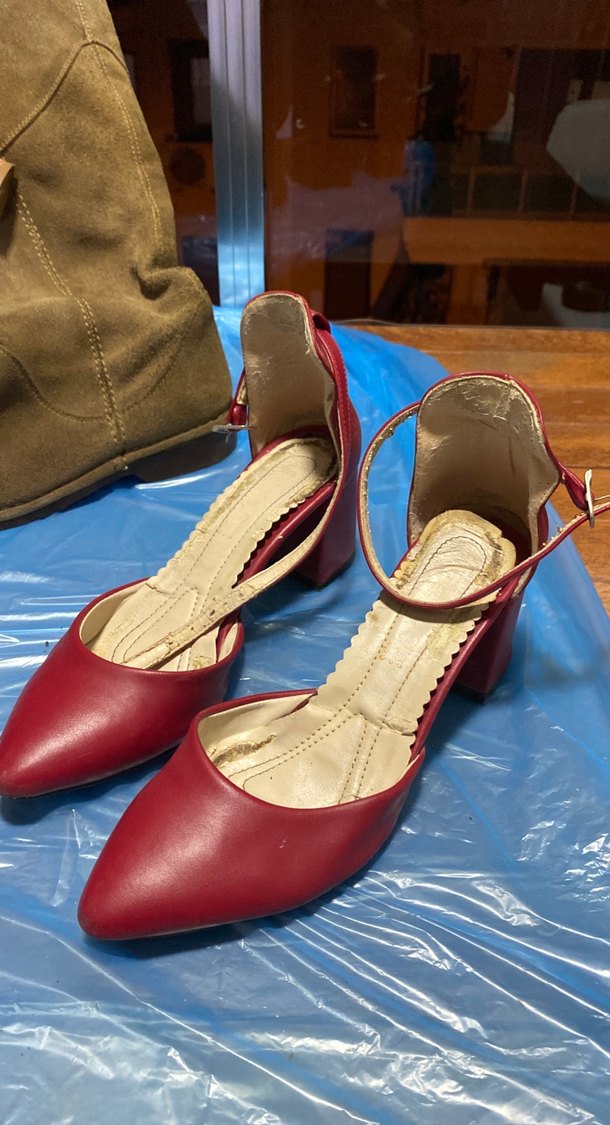 Kırmızı parlak yüzeyli, tokalı ve blok topuklu kadın ayakkabısı. Kauçuk malzemeden yapılmış, günlük kullanıma uygun geleneksel tarzda.
