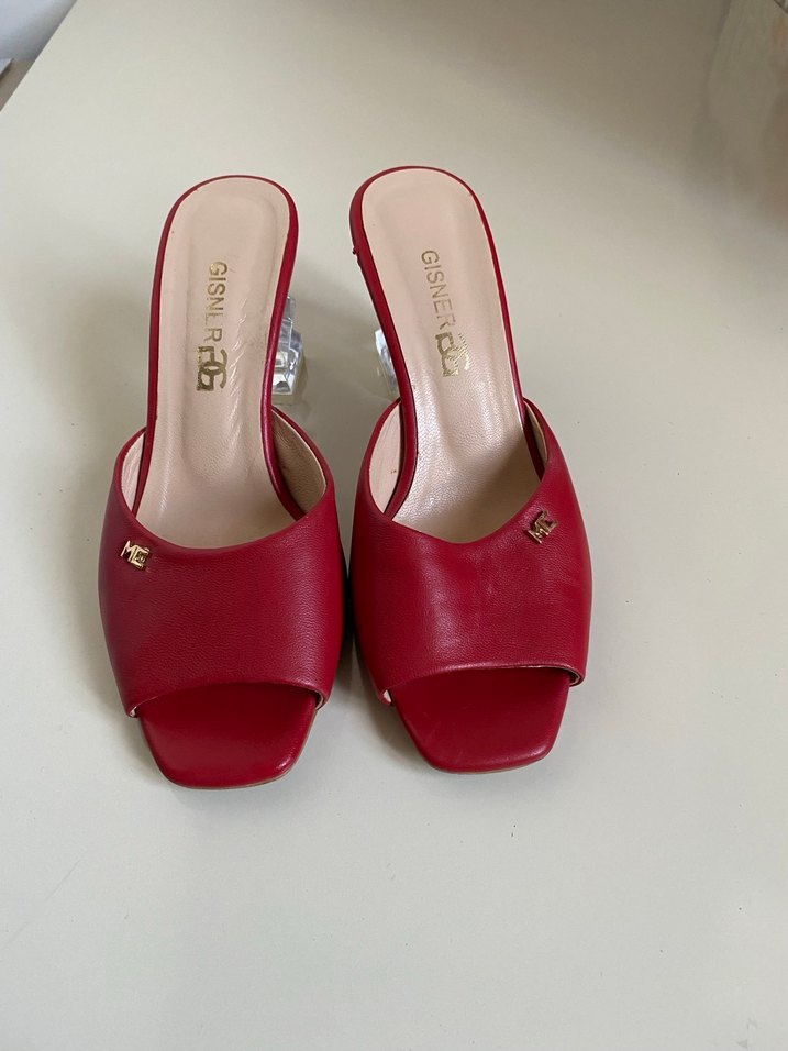 Kadınlar için kırmızı renkte, tokalı ve blok topuklu terlik. Kauçuk malzemeden yapılmış, modern klasik ve minimalist tasarıma sahip, günlük kullanıma uygun.