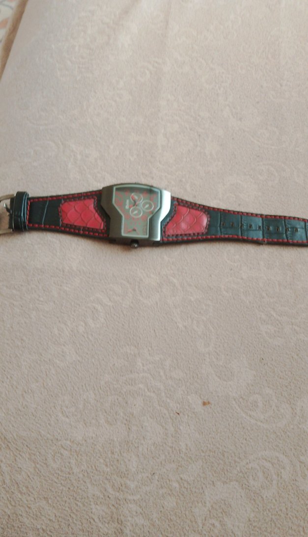Kırmızı ve siyah tokalı kayışa sahip, kafatası desenli vintage tarzda renkli erkek biker saati. ⌚