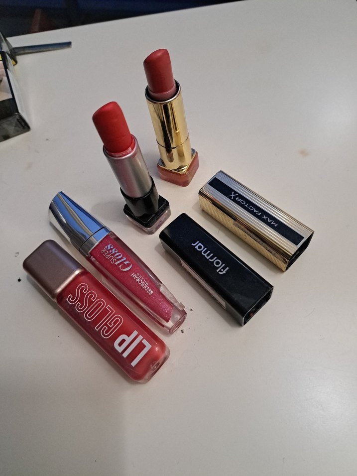 Açık kırmızı tonlarında çeşitli bitişlere sahip ruj ve dudak parlatıcısı seti.
