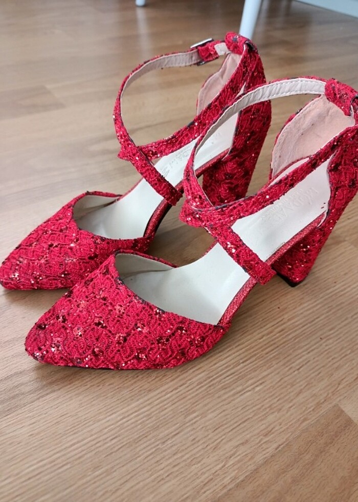 Marka temsilidir. Kına gecesinde kırmızı elbisemle giydiğim ayakkabım. Kalın topukludur, topuk boyu 7 cm, 37 numara tam kalıp. Güpürlü ve parlak pulları var. Rengi kırmızıdır bordo değil. Görünen siyahlıklar var onlar ayakkabının kendisinde mevcuttur, yıpranmış olduğu için değildir. Fotoğrafları inceleyip alın lütfen.
