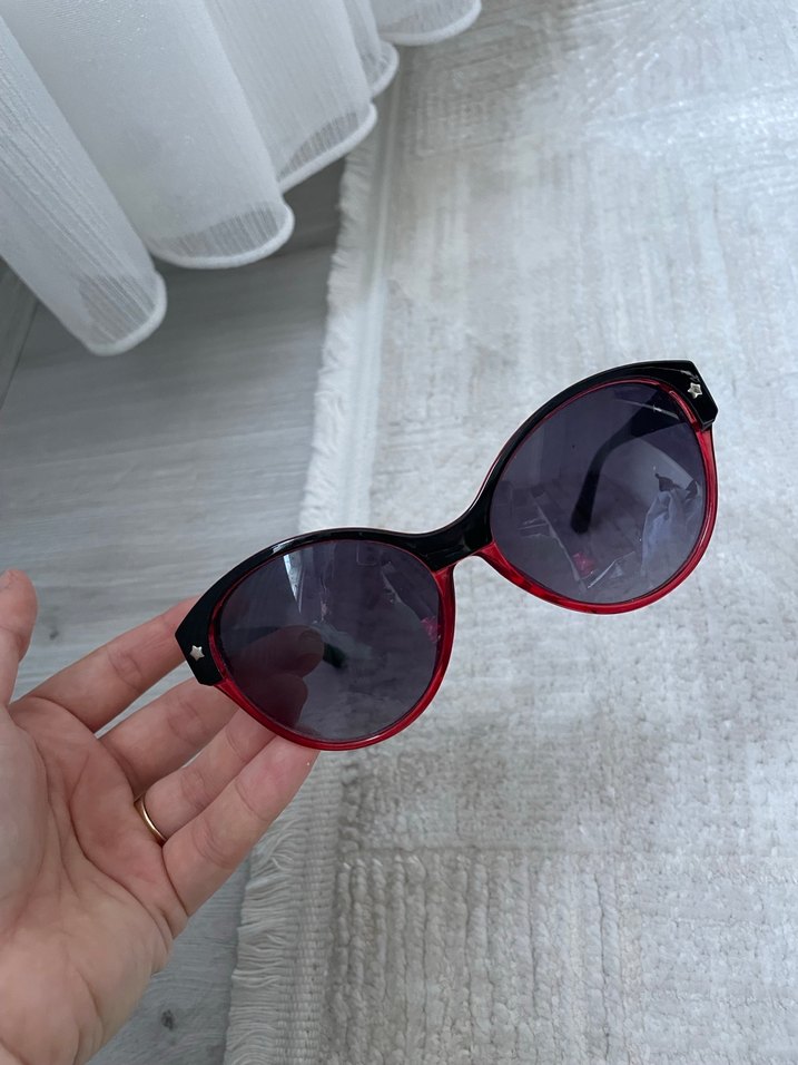 Koyu kırmızı transparan çerçeveli, gotik tarzda kadın güneş gözlüğü. Paris tarzını trend günlük şıklıkla buluşturur. Herhangi bir deformasyon yoktur. Gözlükçüden almıştım 2 bin küsüre kodu falan yazıyor . Markasını hatırlamıyorum . Marka yazan kısım öylesine yazıldı.