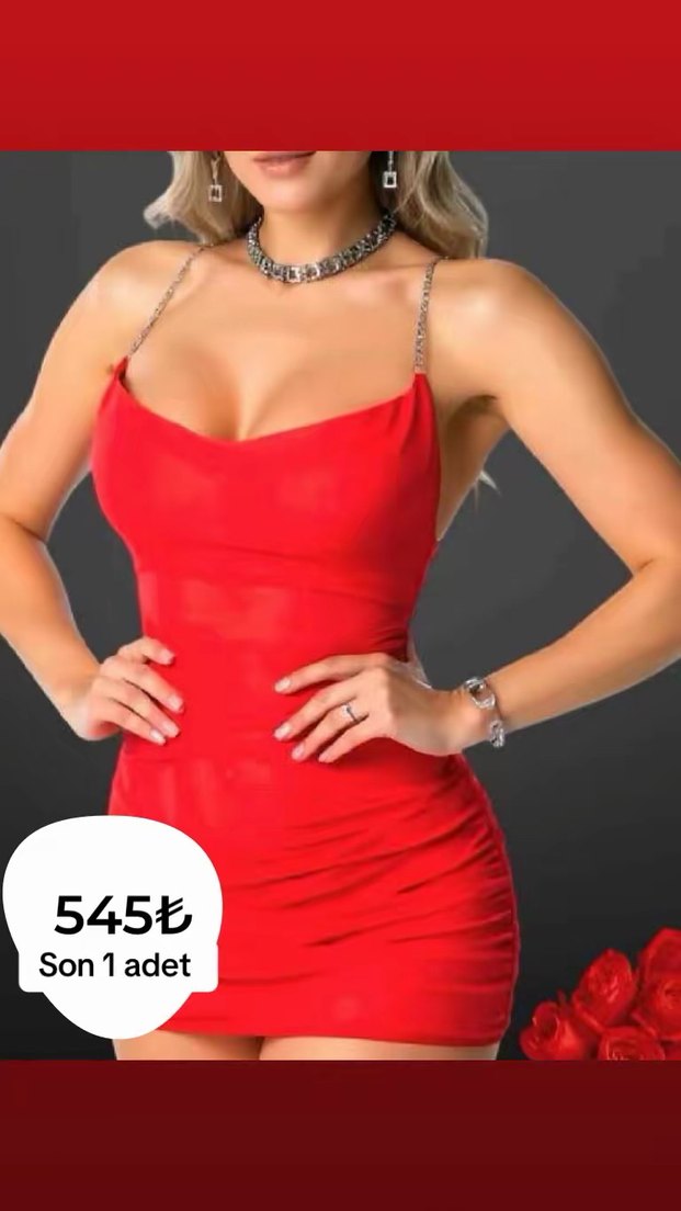 Parlak kırmızı kumaş ve gümüş zincir detaylı, drapeli kadın transparan elbise. Cesur ve göz alıcı, romantik akşamlar için uygun. ❤️