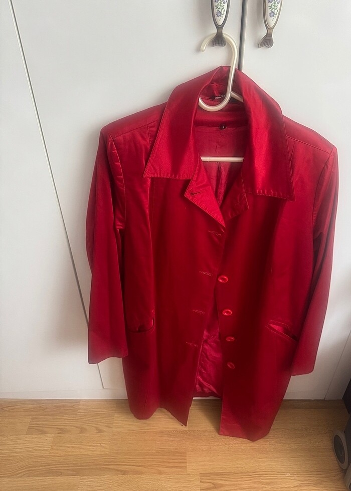 Kırmızı saten parlak şık trençkot çok az kullanıldı hiç bir defosu yok