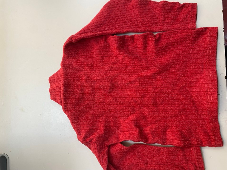 Parlak kırmızı renkte, balıkçı yaka ve uzun kollu, yumuşak keten kumaştan örülmüş, vücuda oturan rahat bir kadın kazağı.