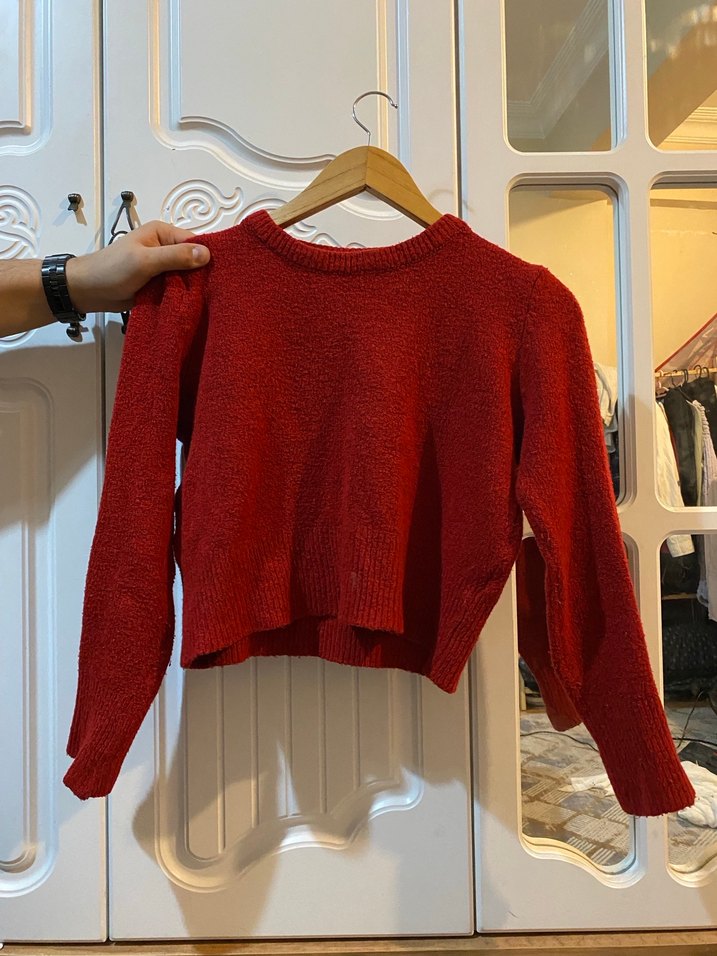 Kırmızı, bisiklet yaka, uzun kollu, triko dokuma, normal midi boy, vücuda oturan kesim, günlük ve sokak modasına uygun rahat kazak.