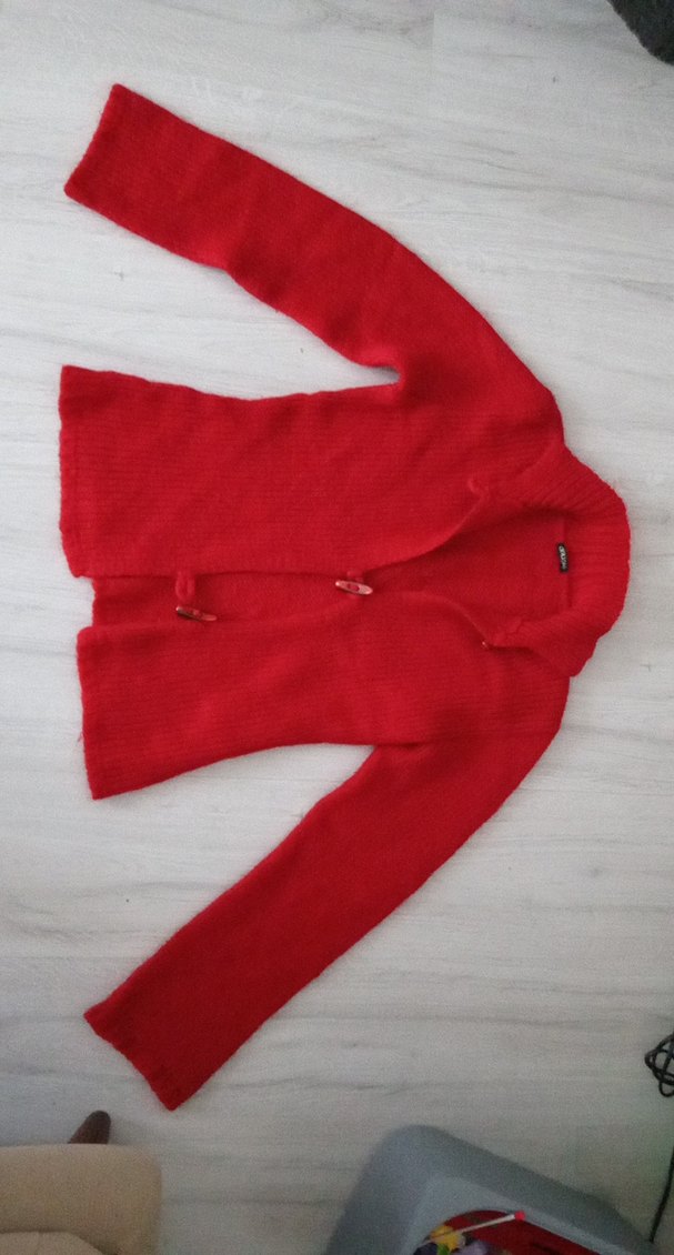 Kırmızı, triko, fitted kesim kadın hırka; yakası notched lapel, uzun kollu ve normal midi boydadır.cokmsicak tutuyor