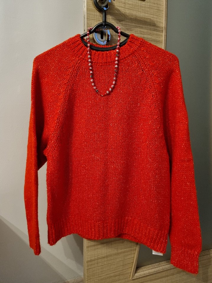 Kırmızı triko kumaştan, yuvarlak yaka ve uzun kollu, bol kesim kadın kazak. Parlak ve rahat dokusu, normal midi boyda, günlük kullanıma uygun.