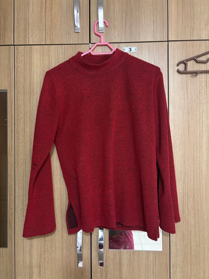 Kırmızı triko kumaştan, uzun kollu, yuvarlak yakalı, bol kesim ve normal midi boyda kadın kazak. Parlak dokusu ve rahat normcore stiliyle günlük kullanıma uygun.