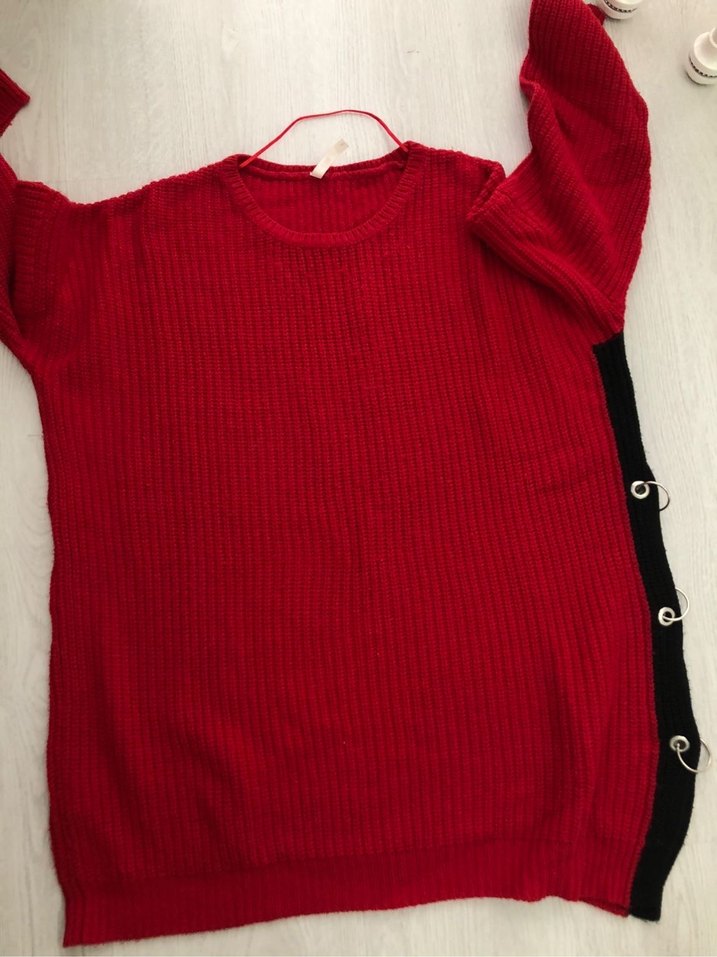 Kırmızı renkli, yuvarlak yaka ve uzun kollu örgü kadın kazak. Rahat kesimi ve midi boyuyla günlük sokak modasına uygun, desensiz ve konforlu bir model. L/40 bedendir yan Demir kısımları açık şekildedir tiftiklenmesi vardır