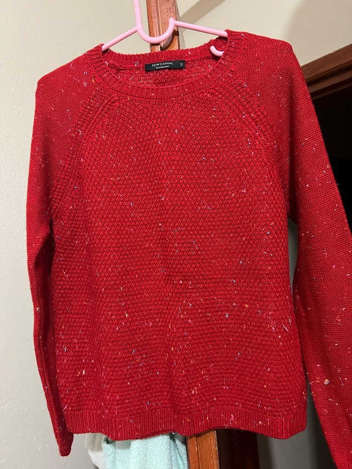 Kırmızı, uzun kollu, yuvarlak yakalı ve triko dokulu bu dar kesim kazak, günlük sokak modası için sıcak ve parlak bir görünüm sunar.