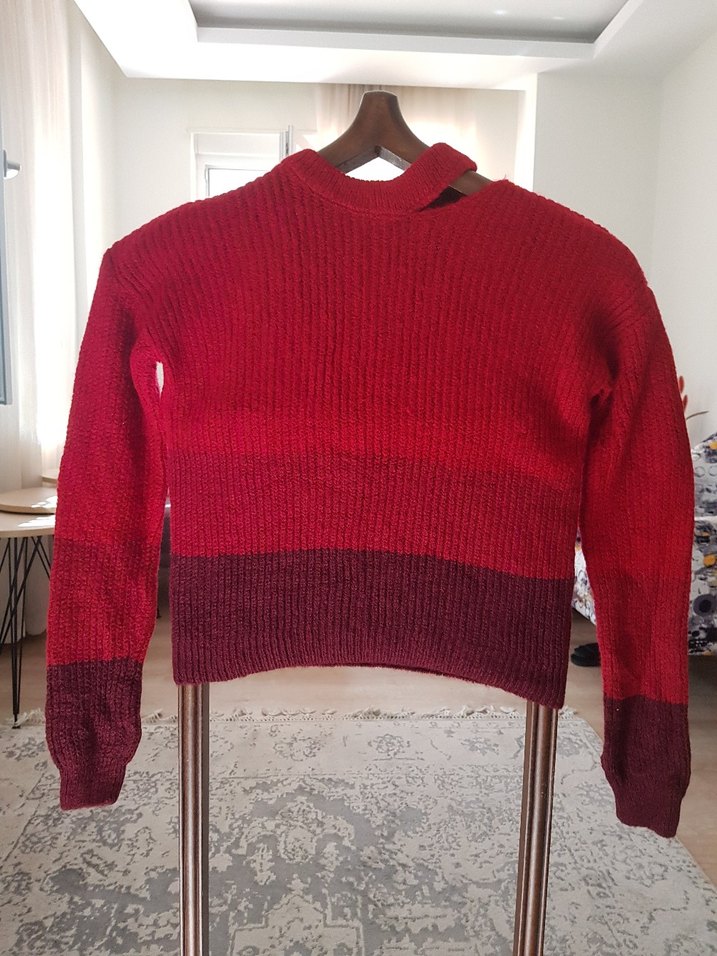 Kırmızı triko kumaştan, bisiklet yaka ve uzun kollu kadın kazak. Rahat ve bol kesim, midi boyda, koyu kırmızı detaylı sade tasarım. Günlük kullanım için uygun.