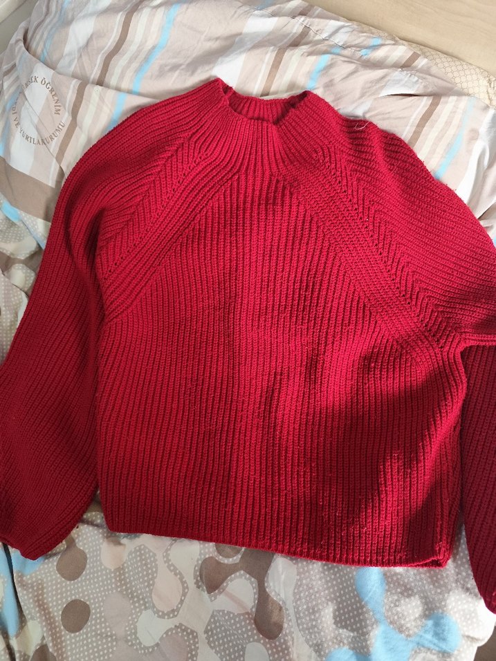 Kırmızı, parlak renkte, yumuşak dokulu triko kazak. Yuvarlak yaka ve uzun kollu, rahat kesimle günlük kullanıma uygundur.