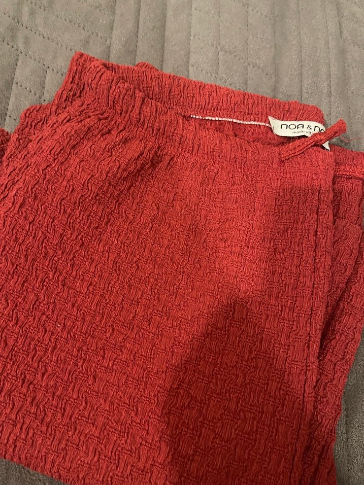Kırmızı parlak renkte, triko kumaştan, bol kesim ve mini boy kadın pantolon. Rahat ve trend sokak tarzına uygun, günlük kullanım için idealdir. Rengi kamerada böyle durmus birazdaha koyu bi renk