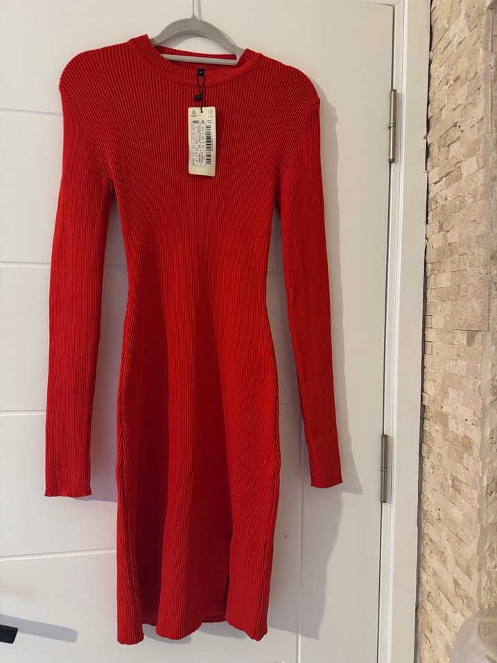 Kırmızı renkte, uzun kollu, yakası yuvarlak, triko kumaştan yapılmış, vücuda oturan kadın midi elbise. Modern klasik tarzıyla romantik buluşmalar için ideal. ❤️