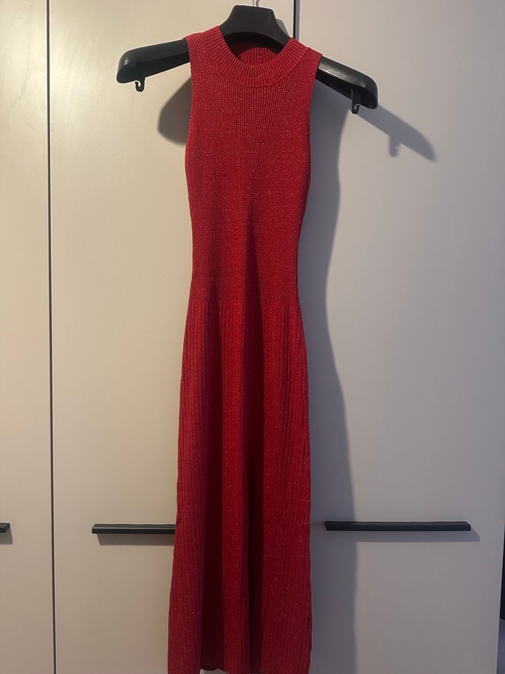 Kırmızı Triko Yüksek Yakalı Uzun Elbise