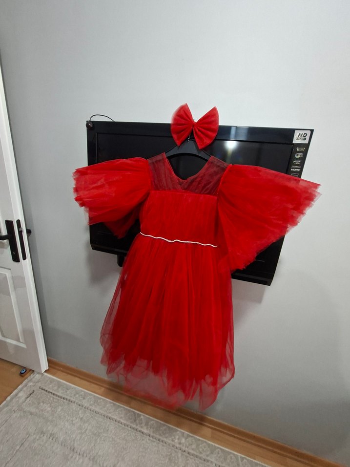 Kırmızı tül kumastan kabarık bir elbisedir 11 -12 yaş sıfır elbise tokasıda mevcuttur