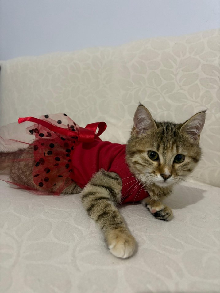 Kırmızı renkli, siyah puanlı tül detaylı, kediler için tasarlanmış şık bir elbise.